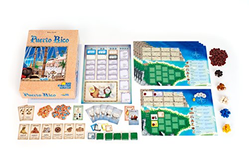 The most critically acclaimed board game of the last twenty years, Puerto Rico continues to wow people with its brilliant mechanics. Each player utilizes different roles -mayor, captain, settler, trader, prospector, craftsman, or builder to score the most victory points with their colony. Players can act on every turn of the game, allowing them to choose between shipping goods for points or building an impressive city. Players must manage their colonists, erect a variety of buildings, build up their plantation, and sell or ship goods. With dozens of options, Puerto Rico is a streamlined game that can be played in about an hour and handles up to five players.